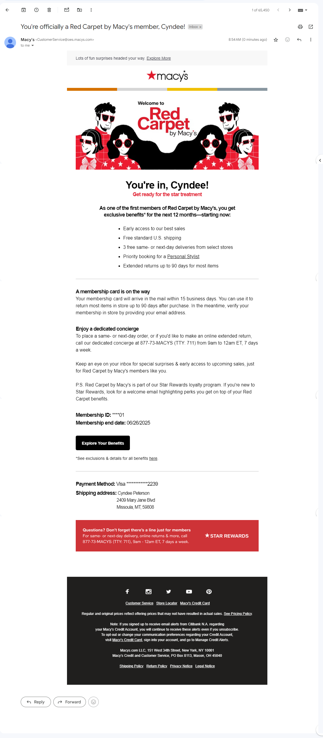 Red Carpet by Macy’s welcome email: I worked with teams across the company, from legal to marketing to loyalty, to highlight the most important details for new members for the 2024 launch of Macy’s Red Carpet membership program.