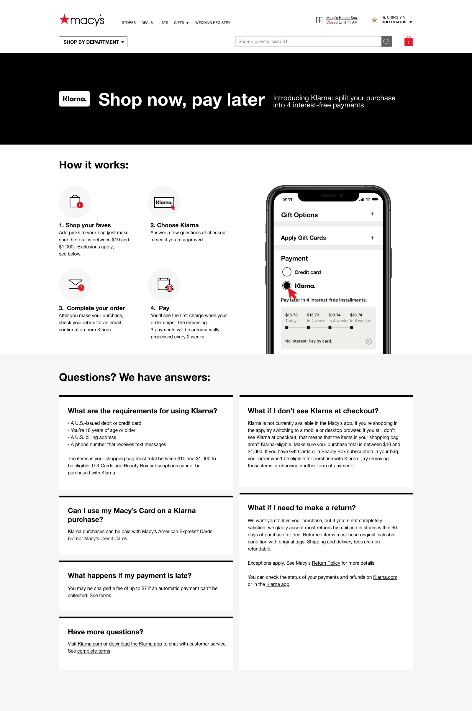 Worked closely with product and legal teams, plus outside Klarna team, to create a conversational, friendly sitelet for the launch of Klarna on macys.com.